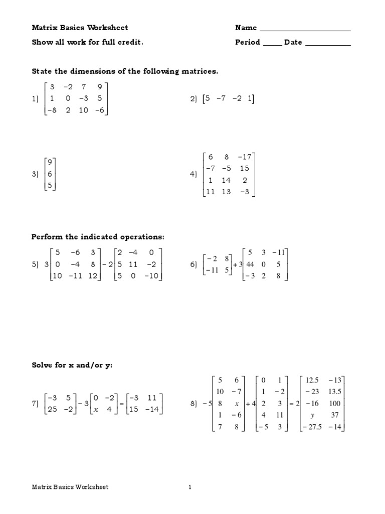 Apr 17 2014 - Matrix Operations Practice Worksheet This is a two page worksheet that includes the following matrix operations. This set includes 4 versions of a matrix operations review. Matrix is an array of numbers in rows and columns.